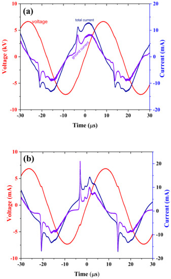 Mixing oxygen gas with argon to generate non-thermal APPJ may seem quite obvious, as shown in Figure 2, which presents the current–voltage waveforms with pure argon in (a) and 0.4 % oxygen (0.018/4.5 slpm) mixed in (b) at fixed ≈14 kV and 29 kHz. Through this work, argon gas was mixed with oxygen at 4.5 argon flow rate. The current values presented in this work are the current peak values. Adding oxygen gas increases the total current from ≈11.3 to ≈18 mA while the ground current increased from ≈8.3 to ≈22.9 mA, which is slightly higher than the total current for the positive half cycle. For the negative half cycle, the total current rises from ≈11.6 to ≈17.2 mA and from ≈8.1 to ≈16.6 mA for the ground one. Moreover, the number of currents peaks for each half cycle normally increases with applied voltage [23]. However, the current–voltage waveform in case of mixing oxygen is presenting the same effect of increasing the current peaks per each half cycle, and this effect could be due to the increase in the residual charge carriers from the privies pulse owing to oxygen electron affinity [20].