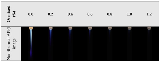 The imaging of the non-thermal APPJ declared that adding oxygen to the plasma accelerates the mode transition from filamentary to diffused mode at lower flow rate values compared to the case of pure argon as illustrated in Figure 3. Normally, the filament is generated inside the diffused plasma at the operation condition 4.5 slpm, 14 kV, and 29 kHz [24]. However, the filament is disappearing by adding oxygen gas. Moreover, increasing the mixing of oxygen gas to the argon non-thermal APPJ causes the shrink of the plasma plume length.