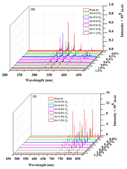 Emission spectra of the argon non-thermal APPJ in the range 200–850 nm at 14 kV, 29 kHz, and 4.5 slpm with different oxygen concentrations (a) and (b).