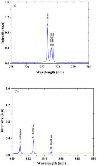 The emission spectrum of the oxygen lines at 14 kV, 29 kHz, and 4.5 slpm argon mixed with 0.036 slpm (0.8%) oxygen (a) and (b).