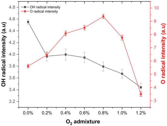The oxygen radical line intensities increase by increasing the addition of O2 to reach the maximum at 0.8%. Then, it decreases with increasing O2 percentage. A similar trend was reported for RF helium discharge with maximum consideration of radical at 0.5% of O2 admixture [25]. The OH-radical band intensity was measured by the summation of the intensity of the OH band from 305 to 315 nm. The obtained OH intensity measurements show an almost linear decrease with increasing the O2 mixture, as shown in Figure 6. This decrease in OH intensity is due to the loss of electrons in the discharge zone, with higher oxygen percentage due to the attachment of electrons with oxygen. Previous studies show that OH was quenched by O through the reaction (OH + O→O2 + H) [26].