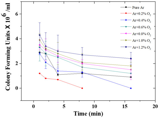 The effect of non-thermal APPJ using pure argon and argon mixed with oxygen molecules on the reduction of colony-forming units (CFUs) of S. epidermidis count is shown in Figure 7. There is a steady decrease in the count of S. epidermidis under all treatments with the maximum reduction achieved for the non-thermal APPJ when argon is mixed with 0.2% oxygen. The reduction for later cases was dropped from 78 × 106 CFU/mL (initial count) to 1.2 × 106 CFU/mL as compared to 2.9 × 106 for pure argon plasma delivered for one minute. Increasing the addition of oxygen to the argon lowered the toxicity of the pure argon plasma where the CFUs of S. epidermidis recorded 3.3, 3.5, 3.9, and 4.3 × 106 CFU/mL after one minute for the plasma-derived from argon mixed with 0.6%, 0.8%, 1.0%, and 1.2% oxygen, respectively. Generally, the extension of exposure time, under different treatments, from 1 up to 16 min leads to a gradual increase in the reduction of CFU of S. epidermidis reaching 0.9 × 106 CFU/mL for pure argon plasma after 16 min. However, there is a steady decrease in the count of S. epidermidis from 78 × 106 to 3.5 × 106 CFU/mL on exposure to plasma for 1 min using pure argon as operating gas. The maximum reduction in CFU was observed at 0.2% O2. No bacterial growth was observed at the later concentration applied for 8 min and the same case was detected at 0.4% O2 applied to 16 min.