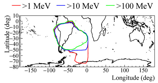 The AP9 model could also be very useful to help define a fiducial area on the Earth’s surface (longitude vs. latitude) that may be applied to the future HEPD data analysis of trapped particles. However, the geographical extension of the inner belt (and consequently of the SAA) is largely dependent on energy, as shown in Figure 2. The surface contours for the >1, >10, and >100 MeV trapped protons are depicted as red, blue, and green curves, respectively, in the panel. These contours highlight how the low-energy trapped proton component is distributed in the southern regions of the SAA-even superimposing to the outer belt, while higher energy populations are more clearly enclosed in the classical boundaries of the inner belt, i.e., in the area above Brazil and the Atlantic Ocean.