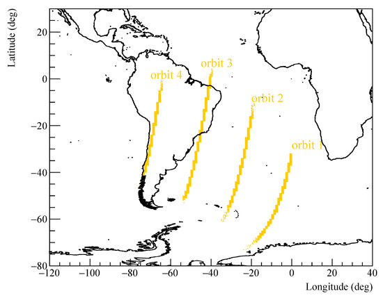 Representation of the four orbits chosen for the time-profile evaluation as a function of geographical latitude and longitude; orbit 1 appears to be more peripheral with respect to, for example, orbit 3.