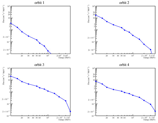 The differential, omnidirectional energy spectra of trapped protons along the four portions of orbits depicted in Figure 3, all generated by the AP9 model, are shown in Figure 4. As energy increases, the spectrum in each orbit decreases with a somewhat different steepness, as expected. This is, in fact, due to the different aspects of the trapping mechanism, which is the resulting effects of cosmic ray albedo neutron decay (CRAND), solar proton injection, and radial diffusion [45]. The CRAND mechanism is the principal trapped proton source above ∼100 MeV, and the shape of the albedo neutron vertical spectrum above the geomagnetic cut-off is very similar to the one observed in trapped protons, i.e., the spectrum is decreasing as energy increases. On the contrary, the solar injection is more relevant below ~100 MeV (and it is more important for L > 2), while the radial diffusion tends to redistribute trapped particles in different L, so its effects are more complex. As a result, the trapped proton flux is strongly anisotropic and the overall spectrum changes rapidly, heavily depending on the region (latitude, longitude, L, etc.) where it is estimated.