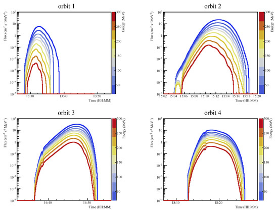 Time profiles (5-s resolution) of 10–300 MeV trapped protons estimated from the AP9 model along CSES orbits 1–4 (from the top left panel to the lower right panel). As expected, higher energies have lower fluxes, while lower energies tend to have higher fluxes.