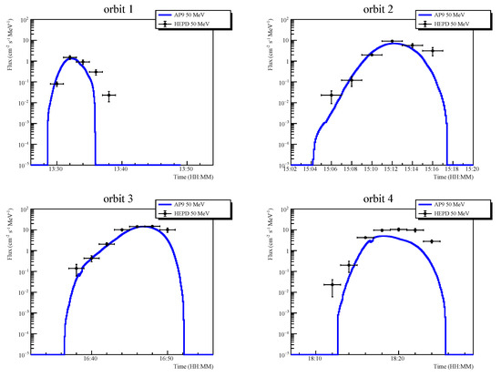 For a further, more precise comparison with experimental HEPD data, four different 20 min orbit portions were selected among those crossing the SAA, in order to build the related time-profiles of protons at various energies (With a period of 94.6 min, the satellite makes ~15 complete orbits per day.):