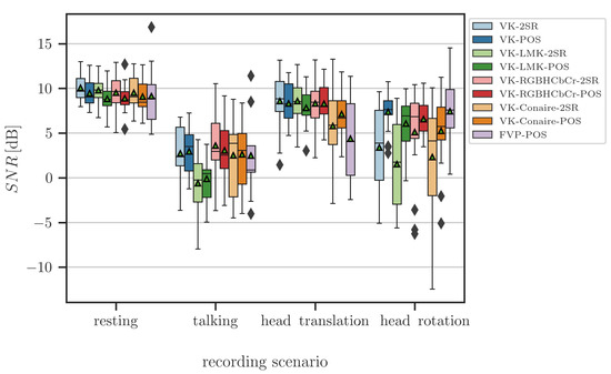 The largest SNR values are achieved for the resting scenario, followed by the head translation, the head rotation and the talking scenarios. For the resting and talking scenario, one-way ANOVA showed no statistically significant differences (at ) of mean SNR values between all pairs of studied approaches ( and ). The boxplot of FVP and VK-RGBhCbCr SNR values exhibits the widest interquartile range for the resting and talking scenarios, respectively. For the head translation scenario, one-way ANOVA showed statistically significant differences in mean SNR values between FVP and (1) VK-POS (), (2) VK-2SR (), (3) VK-LMK-POS (), (4) VK-LMK-2SR (), (5) VK-RGBHCbCR-POS (), (6) VK-RGBHCbCR-2SR (). The boxplot of VK-Conaire-2SR SNR values exhibits the widest interquartile range for this recording scenario. For the head rotation scenario, one-way ANOVA showed statistically significant differences in mean SNR values between VK-POS and VK-LMK-2SR (, VK-POS and VK-Conaire-2SR (), VK-2SR and FVP (), VK-LMK-POS and VK-LMK-2SR (), VK-LMK-2SR and VK-RGBHCbCr-POS (), VK-LMK-2SR and FVP (), VK-RGBHCbCr-POS and VK-Conaire-2SR (), and VK-Conaire-2SR and FVP (). Similarly as in the previous recording scenario, the boxplot of VK-Conaire-2SR SNR values exhibits the widest interquartile range.
