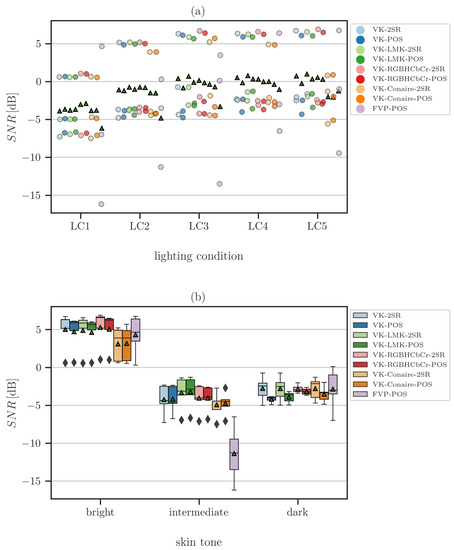 Performance of the studied approaches with and without image processing front-end in combination with two rPPG algorithms (POS and 2SR) in terms of SNR on the example of PBDTrPPG covering (a) different lighting conditions (LC1: lux, LC2: lux, LC3: lux, LC4: lux, LC5: lux) and (b) skin tone challenges. VK: Viola-Jones combined with ROI width reduction and Kanade-Lucas-Tomasi tracker; VK-Conaire: Viola-Jones combined with skin detector based on the maximization of mutual information and Kanade–Lucas–Tomasi tracker; VK-LMK: Viola-Jones combined with landmarks detection and Kanade–Lucas–Tomasi tracker; VK-RGBHCbCr: Viola-Jones combined with RGB–H–CbCr skin-color segmentation and Kanade–Lucas–Tomasi tracker; FVP: Full Video Pulse Extraction rPPG algorithm.