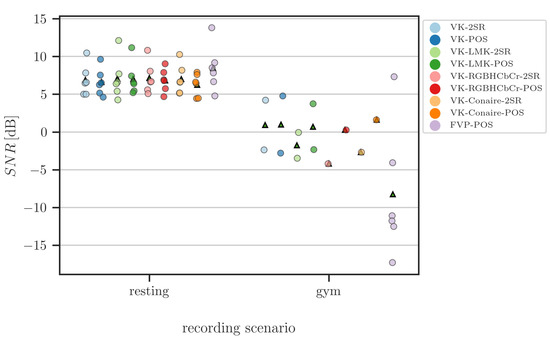There are no significant differences between the SNR values among the studied approaches in case of resting scenario, whereas in the case of gym recordings, FVP performed worse than the other approaches. However, it should be noted that in the case of the approaches with the image-processing front-end, four of the video recordings were not processed successfully. The SNR values of the rPPG signals extracted from these recordings are the ones that lower the mean SNR value for FVP.