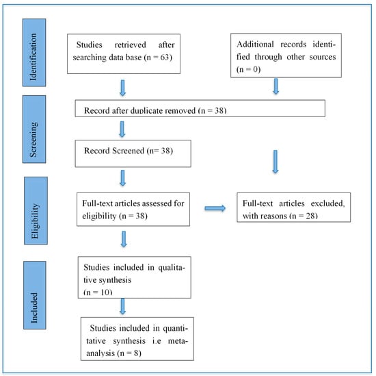 The PRISMA flow chart for the selection of studies is shown in Figure 1. A total of 63 studies were retrieved after the initial search from four databases. No additional record was found by manual search. 38 studies were selected after duplicate studies removal. Selected articles were screened thoroughly, and 28 were excluded based on predetermined criteria. The remaining 10 studies [,,,,,,,,,] were included in qualitative analysis, and meta-analysis was performed on eight articles only [,,,,,,,].