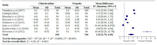 There was significant heterogeneity (Chi2 = 357.26, P < 0.0001, I2 = 98.04%) for the mean CFU count of E. Faecalis bacteria, therefore, a random-effect model was utilized between the groups. A total of eight studies were included for the meta-analyses [,,,,,,,]. The overall mean difference for E. Faecalis CFU between antibacterial effect of Propolis and CHX (control) was statistically significant (SMD = 3.20 [1.70, 4.69] Z = 4.20; p < 0.001). Although Propolis showed a significant reduction of E. Faecalis as compared to no treatment, CHX exhibited a significantly higher antimicrobial effect on E. Faecalis in comparison to Propolis (p < 0.001) (Figure 2).