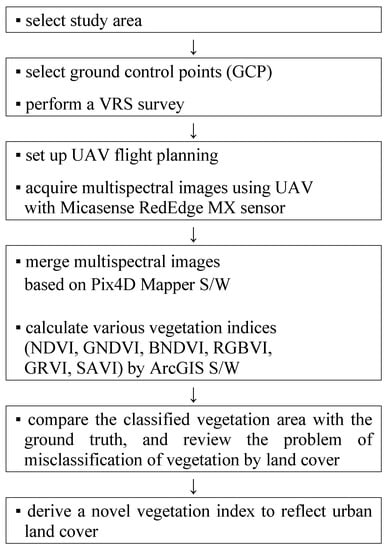 Satellite imagery is effective in analyzing vegetation in a large area. However, since the satellite moves only in a fixed orbit, it is difficult to obtain the image at the desired time. In addition, the resolution of multispectral satellite images such as Landsat ETM + has limitations in studies that require very precise analysis. Therefore, in the case of small urban areas, UAV research that can quickly take an image at a desired time is being used a lot. In particular, since the UAV system can be equipped with a multispectral sensor, it is easy to conduct various vegetation studies.
