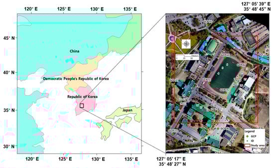 Figure 2 shows the part of the Vision College of Jeonju-si, located in Jeollabuk-do, Republic of Korea, that was selected as the target site of this study. The area contains vegetation areas, such as trees and lawns, as well as non-vegetation areas, such as an artificial grass playground, playground tracks, urethane basketball courts, long-run steel roofing, and waterproof coated roofs.