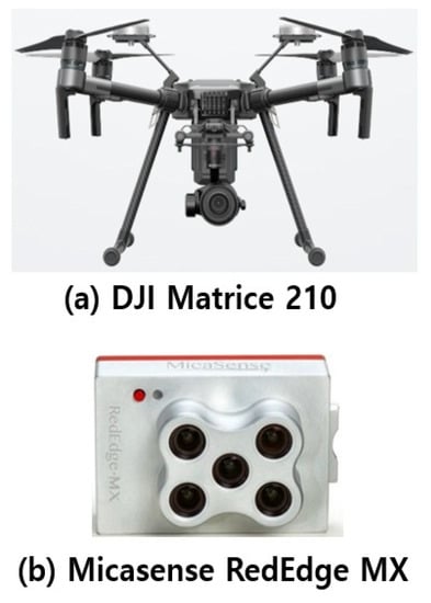 Figure 3a shows the DJI Matrice 210 UAV equipped with the Micasense RedEdge MX sensor, which was used to obtain multispectral images. The Micasense RedEdge MX sensor is widely used to analyze vegetation, agricultural management practices, and water quality because it can acquire blue, green, red, and near-infrared spectral images [,,,]. Its resolution is about 8 cm at an altitude of 120 m, providing very precise image information, and its weight is 231.9 g, which is very light [], so it has the advantage of allowing sufficient flight time for the DJI Matrice 210, as shown in Table 1.