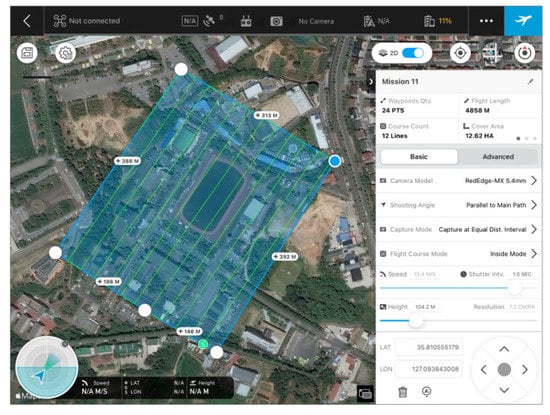 The DJI GS Pro S/W was used to establish the UAV flight plan, as shown in Figure 4. The degree of longitudinal and lateral redundancy were designed to be 80% and 70%, respectively, and photography was performed at a flight altitude of about 100 m to acquire images with a resolution of 6 cm. Radiometric calibration was performed before the flight using a calibrated reflectance panel (CRP) and the incident light sensor of the Micasense RedEdge MX camera.