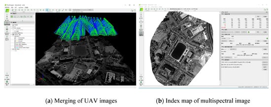 In addition, images from each band were merged using Pix4D Mapper S/W, and index maps were constructed for each red, green, blue, and near-infrared image to calculate the vegetation index (Figure 5).