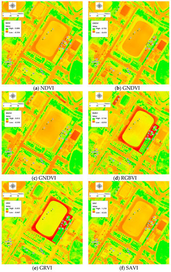 The Normalized Difference Vegetation Index (NDVI), reported by Rouse et al. [], is one of the most commonly used vegetation indices [,,,,]. Many other vegetation indices are also used in research, including the Green Normalized Difference Vegetation Index (GNDVI), Blue Normalized Difference Vegetation Index (BNDVI), Red Green Blue Vegetation Index (RGBVI), Green Red Vegetation Index (GRVI), and Soil Adjusted Vegetation Index (SAVI).