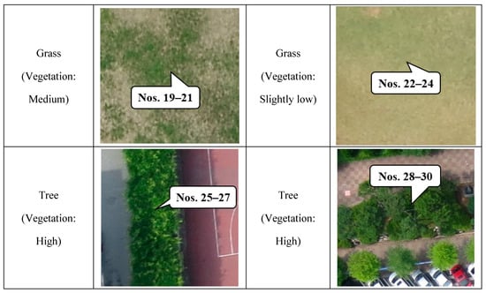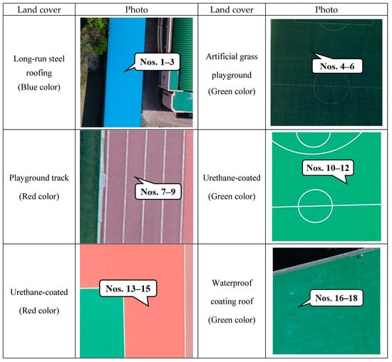 The target area contains various types of land cover, such as trees, grass, an artificial grass playground, long-run steel roofing, waterproof coated roofs, and urethane-coated areas. Therefore, as illustrated in Figure 7, a representative location was selected for each type of land cover, and three sample points were chosen for each location.