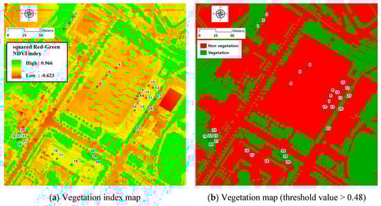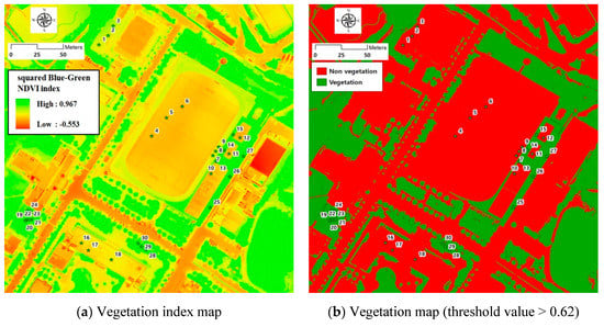 First, using the squared Blue-Green NDVI index, the vegetation indices of the red urethane-coated areas (Nos. 13–15) ranged from 0.72 to 0.74, which were slightly higher than the values of lower-vitality grass (Nos. 22–24). Therefore, as shown in Figure 8b, when 0.62 (the minimum value of lower-vitality grass) was set as the threshold value, the red urethane-coated areas were misclassified as vegetation.