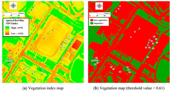 Finally, using the squared Red-Blue NDVI index, the vegetation indices of the long-run steel roofing (Nos. 1–3), urethane-coated (Nos. 10–15), and waterproof-coated (Nos. 16–18) areas were all lower than the vegetation index of lower-vitality grass (Nos. 22–24). Therefore, as shown in Figure 10b, when 0.61 (the minimum value of the lower-vitality grass) was set as the threshold value, only areas with trees and grass were classified as vegetation areas, see Table 7.