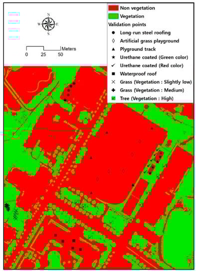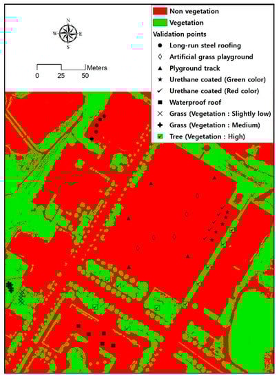 To quantitatively verify the novel vegetation index proposed in this study, five validation points were selected for each type of land cover through field surveys. Among these points, twenty validation points in grass and trees were classified as vegetation, while thirty validation points in the areas with long-run steel roofing, artificial playgrounds, playground tracks, urethane coatings, and waterproof coated roofs were classified as non-vegetation.