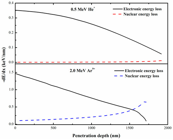 Room-temperature irradiations with 0.5 MeV He+ and 2 MeV Ar9+ ions were performed by a 320 kV electron cyclotron resonance (ECR) ion source. All experiments were carried out in a heavy-ion accelerator research facility, Lanzhou (HIRFL). During the experiment, beam currents for He and Ar ion irradiations were set to 15.0 μA and 6.0 μA, respectively. It is worth noting that different scenarios were followed in experiments. First, part of the samples were irradiated by He ions with different fluences. In the second scenario, the other part of the samples were irradiated by Ar ions. Finally, the samples pre-irradiated with 1.1 × 1013, 1.7 × 1014, 1.1 × 1015 and 1.7 × 1016 Ar cm−2 were irradiated with 3.3 × 1016 He cm−2. In this regard, Figure 1 illustrates the stopping power against the projectile ranges. It should be indicated that the SRIM2010 code was used in the present study to calculate the total displacements of the collision events in the irradiated samples with 0.5 MeV He+ and 2 MeV Ar9+ ions. Table 2 presents details of irradiation and stopping power of ions.