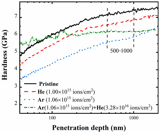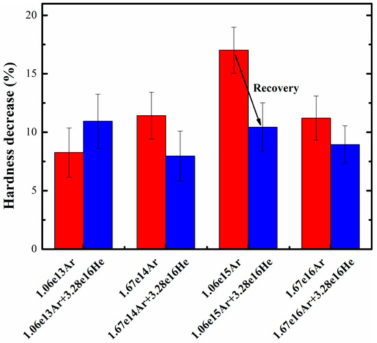 It was observed that Ar ions imposed high and intermediate damage levels (i.e., 17.0% and 11.5%, respectively), while He ions imposed a low damage level (i.e., 8.4%). Moreover, Figure 4 indicates that He ions induced different degrees of the recovery effect in the hardness of the Ar pre-irradiated specimens. More specifically, both the maximum and intermediate damage levels recovered to the saturation damage level of He ion irradiation.