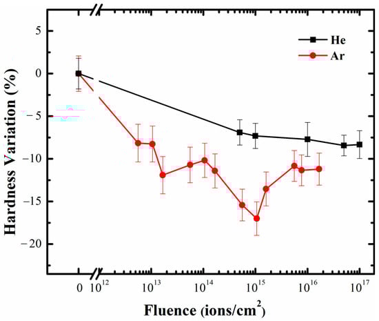 Variations of hardness against the He irradiation in Ar pre-irradiated samples.