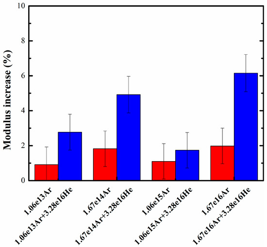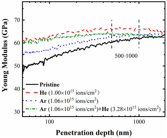 Figure 5 illustrates the distribution of the Young modulus for irradiated borosilicate glass exposed at the ion fluence of 1.0 × 1015 ions/cm. Investigations have demonstrated that the elastic affected region is significantly larger than that of the plastic region [15]. Accordingly, a plateau region did not appear in the modulus distributions of the irradiated specimens. Consequently, the measured values corresponding to the penetration depths of 500 nm to 1000 nm were applied to analyze the modulus of the ion-irradiated specimens. In this regard, Figure 6 shows that as the He and Ar ion irradiation fluences increased, the corresponding mean Young modulus of the irradiated borosilicate glass increased slightly. The maximum increase of modulus was less than 5%. Unlike hardness distributions, Figure 6 indicates that there was no obvious ionic correlation between the modulus variation and tendency. Meanwhile, Figure 7 shows that the modulus of the Ar pre-irradiated glass increased as the intensity of the He ion irradiation increased. It was observed that the upper and lower bounds of the increment were about 6.2% and 1.8%, respectively. The maximum hardness recovery and the minimum modulus increase were for the same sample.