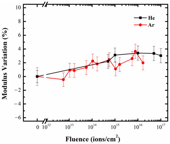Distribution of modulus against He and Ar ion fluence in borosilicate glass.