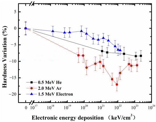 In order to understand the influence of energy deposition on the hardness and modulus, evolutions of the mechanical properties induced by the irradiation of He and Ar ions were compared with the electron irradiation data [15]. Figure 8 and Figure 9 illustrate variations of the mean hardness and modulus against the electronic energy deposition. It was found that variations of the mean hardness induced by electron irradiation had a different trend with the ion irradiation scenario. Although the maximum reductions in the electron and He ion irradiation for the deposited electronic energy of 1022 keV/cm3 were the same, there was an obvious reduction in the hardness induced in the ion irradiation scheme at a lower electronic energy deposition. The maximum hardness reduction in the Ar-ion-irradiated specimen was much greater than that of the electron-irradiated specimen. It was thus inferred that compared to the electron-irradiated scheme, Ar ions induce larger damage at the same electronic energy deposition. Moreover, the Young modulus decreased after electron irradiation, while it increased after ion irradiation. These discrepancies may be attributed to the influence of nuclear energy deposition of He and Ar ions on the hardness reduction and increase of the Young modulus.