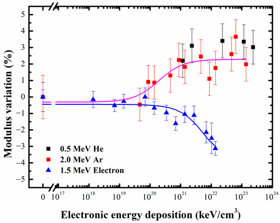 Distribution of modulus against electronic energy deposition in borosilicate glass (the magenta curve is the fitting curve of the modulus variation caused by Ar and He ion irradiation).