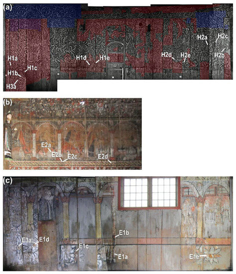 Additionally, minium was individuated in samples from both churches (Figure 6c,d); only traces of Pb3O4 and hematite were found in samples H1d, H2a and H2b, while samples E2d and E3a showed considerable relative amounts of minium (~33.6%), associated to other Pb-oxides such as Litharge and Massicot (tetragonal and orthorhombic PbO, respectively). Red ochre and minium have previously been identified in the pictorial layer of 1600–1700s and medieval stave church wall paintings, respectively [1]. However, combining minium and hematite was not mentioned in [1], although stave church artists during this period were known to mix pigments.