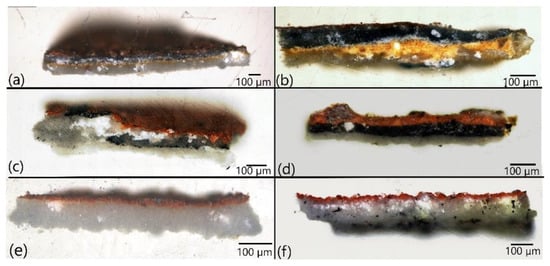 A subset of the paint fragments was prepared as cross-sectional samples, with the common stratigraphy shown in Figure 4. These cross-sectional samples suggest that the wooden planks were first prepared with a white ground layer, which is consistent with the distemper technique within stave churches [4]. Typically, this basecoat also acted as the background color [3,5] once dry the pictorial image was executed in a rapid manor so as not to re-solubilize the basecoat [1,4]. Additionally, the artists’ process of mixing pigments is easily observed in the paint fragments from Heddal and Eidsborg (Figure S1, see Supplementary Material). See Figure S2 and Table S5 in Supplementary Material for images of all cross-sections and summary of layer thickness.