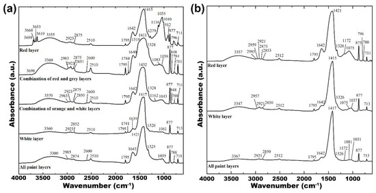 Some of the FT-IR spectra showed profiles differing from the common features obtained for the same typology of layer (e.g., red or white). This is the case of the red layer from E1c that displayed a pronounced broad band between 990 and 1290 cm−1 (Figure S6, see Supplementary Material). Such spectral regions host features compatible with those of a sulphate (983, 1087, 1116 and 1182 cm−1), probably barite (BaSO4) to which the two uncertain peaks at 611 and 638 cm−1 also seem to be attributable.