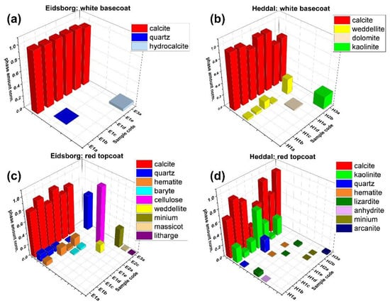 Semi-quantitative phase amounts of specimen from Heddal and Eidsborg by X-ray diffraction (XRD). (a) White basecoats in Eidsborg; (b) White basecoats in Heddal; (c) Red topcoat in Eidsborg; (d) Red topcoat in Heddal.