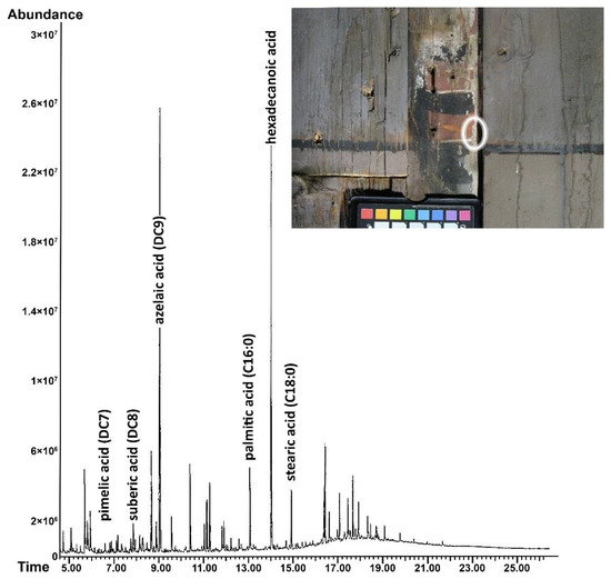 Finally, GC results also showed contamination to the paint layers. Allantoin, a product of urine, was found in the ground layer of E3a (Figure 7), but not in the upper layers. The most probable explanation of its presence is that it was excreted from a housefly before the artist applied the motif. Additionally, GC-MS (Table 4 and Figure 8) and IR (Table S14, See Supplementary Material) analysis of samples from both churches showed the presence of wood itself, or wood-derived products (e.g., resin), strongly indicating that the wooden planks are contaminating the painted layers. Additionally, in some cases, the spectral features almost completely mask absorption bands related to other compounds (e.g., E2b, Table S13 in Supplementary Material). As this case study focuses on polychrome wooden structures, it is not surprising that the acquired results included peaks readily assigned to wood.