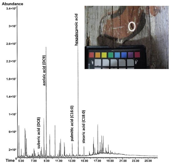 GC-MS analysis can also be used to examine the presence of glycerol in a paint sample, if an abundant amount of oil is present. However, this is complicated by the fact that glycerol can also be derived from egg yolk [47]. For the samples examined, glycerol was not detected (Figure S8, see Supplementary Material). Additionally, if a whole egg were used, the lipid content of the untreated sample (E2a) would have been greater than 0.01%.