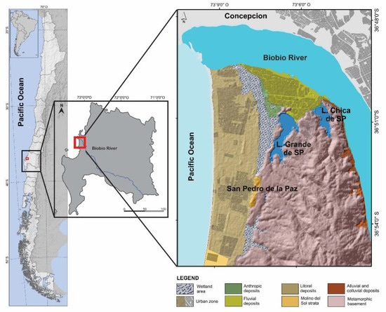 - Martinez, C.; Rojas, C.; Rojas, O.; Quezada, J.; Lopez, P.; Ruiz, V. Crecimiento urbano sobre geoformas costeras de la llanura de San Pedro, área Metropolitana de Concepción. In En las Costas del Neoliberalismo: Naturaleza, Urbanización y Producción Inmobiliaria: Experiencias en Chile y Argentina; Hidalgo, R., Santana, D., Voltaire, A., Arenas, F., Salazar, A., Valdebenito, C., Alvarez, L., Eds.; No. 23; Geolibros: Santiago, Chile, 2016; pp. 287–312. [Google Scholar]