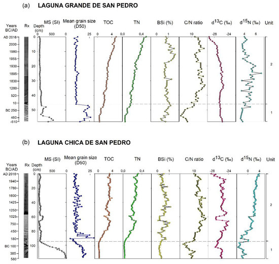 - Frugone-Álvarez, M.; Latorre, C.; Giralt, S.; Polanco-Martínez, J.; Bernárdez, P.; Oliva-Urcia, B.; Maldonado, A.; Carrevedo, M.L.; Moreno, A.; Huertas, A.D.; et al. A 7000-year high-resolution lake sediment record from coastal central Chile (Lago Vichuquén, 34°S): Implications for past sea level and environmental variability. J. Quat. Sci. 2017, 32, 830–844. [Google Scholar] [CrossRef]