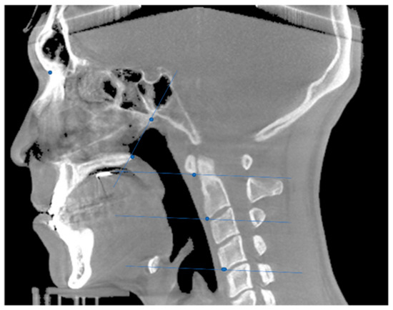 Five coordinates for each original image were obtained manually in the midsagittal plane of the CBCT images (Figure 1). The definitions of the points and planes for the airway division are presented in Table 1, referring to Lee et al. [28]. These five coordinates were predicted by a 2D convolutional neural network for airway segmentation in the sagittal direction.