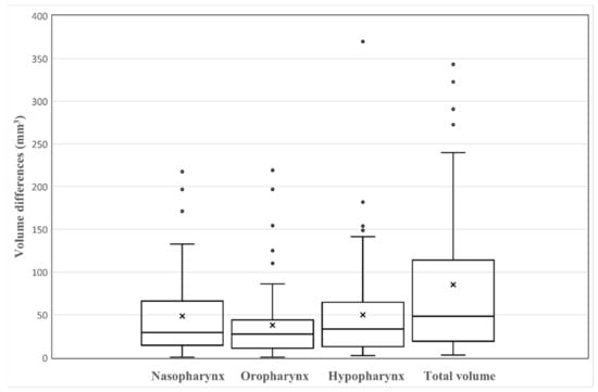 The difference between the total volumes in this study was evaluated as an acceptable value at 0.46 cm3 when compared to the Torres et al. [25] study, which gave the difference between the water volume of an actual prototype and the volume on the CT software as 0.2 cm3 to 1.0 cm3. The difference in the volume of the oropharynx was measured as the smallest, which showed the same results as El et al. [34]. According to Alsufyani et al. [23], since the oropharynx airway is a completely empty space like a tube, it is straightforward to measure the volume. The more complex and narrow shape of the airway’s soft tissue is due to anatomical complexity, such as epiglottis. This has the highest error in volumetric measurements [35]. Therefore, it can be considered that a simpler anatomical structure will result in a smaller difference between the measurement methods.