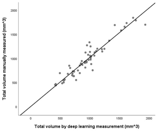 Scatter plot of total volume measured between the manual of deep learning (r2 = 0.975, slope = 1.02, p < 0.001). The line indicates a linear regression graph. There is a strong correlation between the two methods (N = 61).