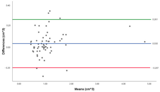 Bland-Altman plot of the total volume data set. The green line indicates the upper limit of agreement, while the red line indicates the lower limit of agreement (N = 61).