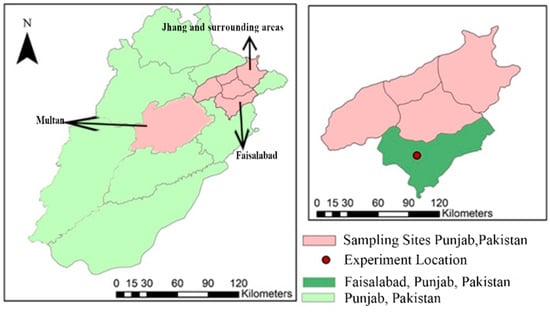 The soil samples were collected from various regions of the Punjab province of Pakistan (Figure 1). The random sampling was carried out in the districts of Jhang, Faisalabad, and Multan from hydrocarbon-contaminated soils. Composite samples of 1 kg were prepared by sampling at different locations. Sampling sites were areas used for oily chemical sludge drainage and processing. Soil samples were collected using tube augar. The soil sampling thickness was up to 90 cm from the ground layer. The four soil samples obtained were used to extract 10 microbial isolates, and composite samples were used to test the total hydrocarbon content of petroleum (TPH). The collected soil samples were stored at 4 °C in the dark in zipped plastic bags prior to use for bacterial isolation and sample TPH contamination assessment.