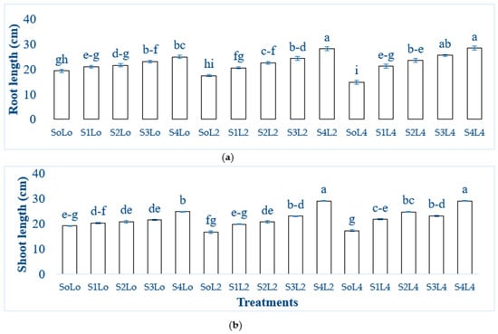Bacterial inoculation significantly improved the roots of inoculated maize crop. Under higher contamination of crude oil, bacterial strains S4 (PMEL-79), S3 (PMEL-80), S2 (PMEL-67), and S1 (PMEL-63) significantly enhanced the root length of maize, which was recorded as 48.08%, 42.18%, 37.27%, and 30.15% higher than control S0L4, respectively. Of all the strains, the bacterial strain S4 (PMEL-79) increased the root length more significantly then the other strains, as shown in Figure 3a, reaching a level that was 32.11% higher than control S0L0. The lowest root length was observed in treatment SoL4, where no strain was added and 2000 ppm of crude oil was applied. The bacterial inoculation significantly affected the root length in crude oil concentration; i.e., 1000 and 2000 ppm, respectively. The elongation of shoot of maize was significantly enhanced by bacterial strains S3 (PMEL-80) and S2 (PMEL-67), by 16.9% and 20.41% more than the control, respectively. The highest increases in shoot length were observed in strain S4L2, which was 33.94% higher than control S0L0 (Figure 3b). The results show that, overall, the S4 (PMEL-79), strain performed very well as it increased the root and shoot length of maize under both lower and higher levels of crude oil contamination in soil.