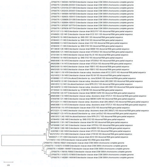 Neighbor-joining tree illustrating the phylogeny of Enterobacter cloacae subsp. branches, which are labeled with a parsimony bootstrap built using Mega X.