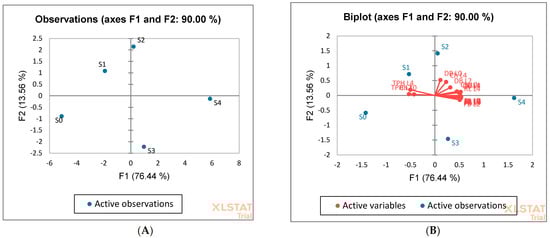 On the basis of the results of the bioremediation assay, a trial was conducted under crude oil-contaminated conditions; four strains (S1, S2, S3, and S4) were used to verify the TPH degradation in maize. The principle component analysis was used to test the results. Factor coordinates of bacterial strains based on TPH content, root length, shoot length, biomass production, and chlorophyll content are presented in Table 4. The maximum coordinate value (5.82) was observed in S4 (PMEL-79) followed by S3 with an F1 value of 0.96 (PMEL-80). Factorial planes clearly show their unique behavior in terms of the TPH degradation and growth promotion of maize. The total variability between F1 and F2 biplots is 90%. The Pearson’s correlation matrix showed that variables other than chlorophyll content were positively correlated. We detected some correlation between the TPH content, biomass production, shoot length, and root length, while there was negative correlation for the chlorophyll content. The active coordinates retained by PCA were used to construct the biplot in Figure 6.