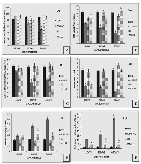 Variation in the anti-oxidant enzyme activity and histopathological index (HAI) in liver of C. carpio exposed to malachite green and E. officinalis for 15, 30 and 60 days. (A)—Catalase; (B)—Superoxide dismutase; (C)—Glutathione-S-Transferase; (D)—Reduced Glutathione; (E)—Lipid peroxidation; (F)—Histopathological Alteration Index. Abbreviations: CON: control; 0.146 MG: 0.146 mg/L MG; EO: Emblica officinalis; MG + EO: 0.146 mg/L MG + E. officinalis. “a” indicates significant (p < 0.05) change with respect to control in MG treated fish, and “b” indicates significant amelioration (MG + EO) with respect to MG treatment (n = 9).